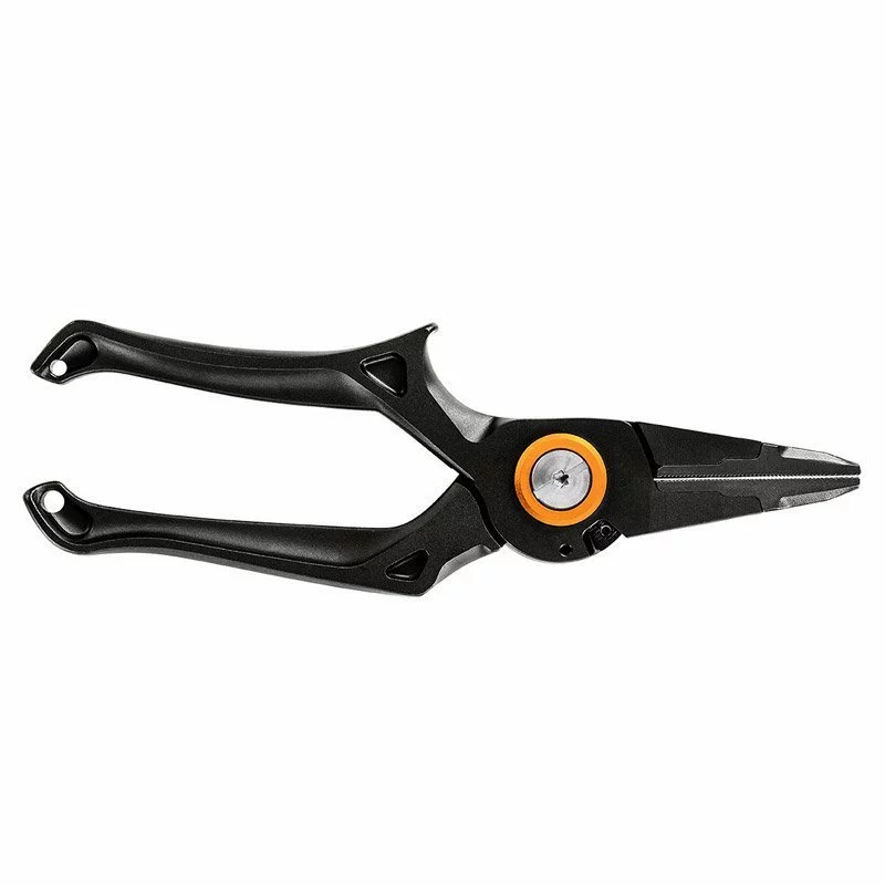 The pliers are a hot-forged aluminum construction, allowing the metal to be manipulated into the ergonomic design as well as give the pliers unrivaled strength. The spring-loaded pliers lessen hand fatigue and are held in check by a plunge lock – meaning the tool won’t open unexpectedly when you’re on the move or catching fish. The nylon sheath includes a belt loop, d-ring, and coiled plier lanyard and can be tethered from multiple points.