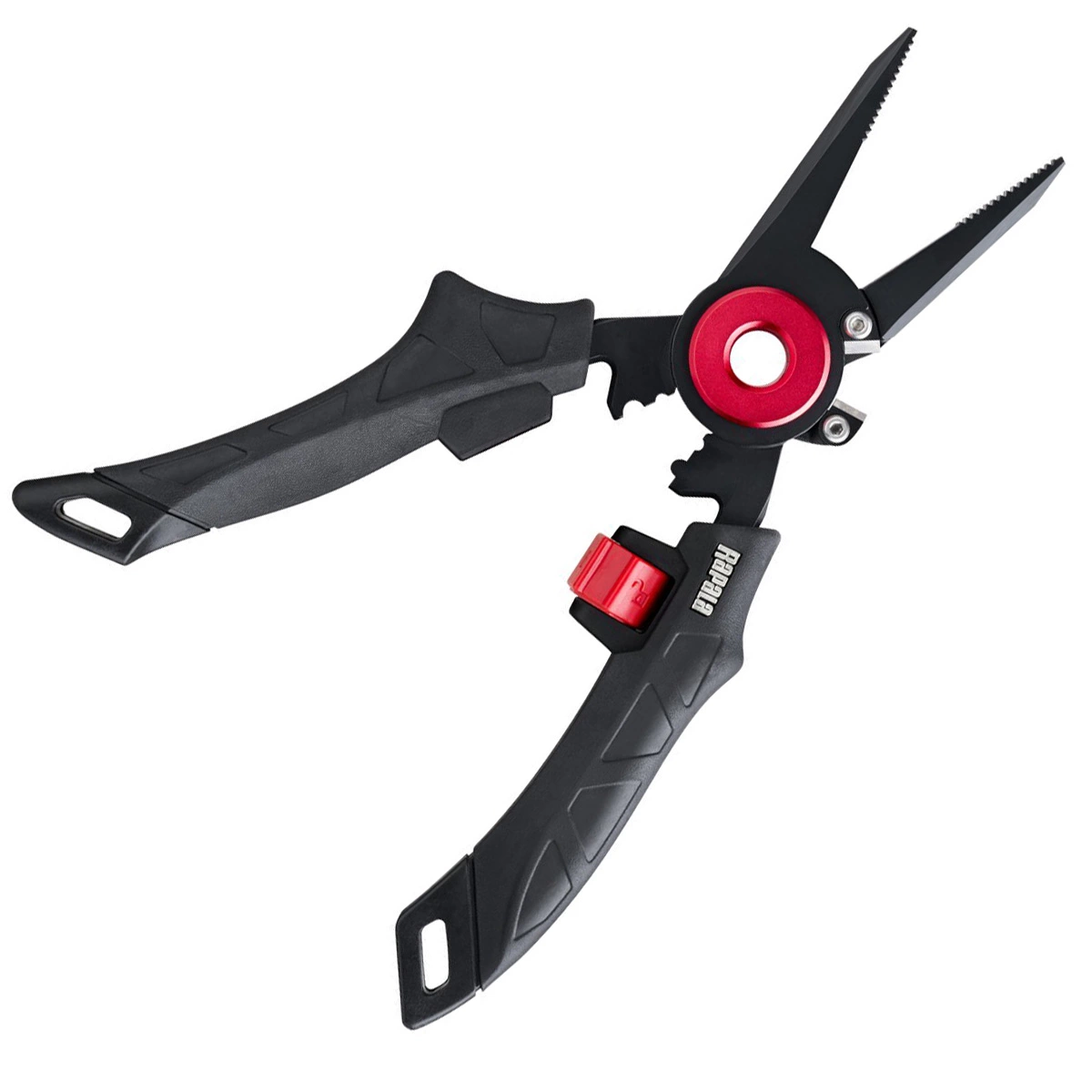 Reversible MagSpring locks the pliers in closed position when not in use and when reversed, act as a spring to hold the jaws open and ready. Replaceable carbide cutters for braided, monofilament and fluorocarbon line and wire up to 15 lbs (6.8 kilos). Hybrid jaws with an interlocking front grid for a secure grip on hooks. Crimping tool to help rigging. Comes with a neoprene sheath and a coil lanyard.